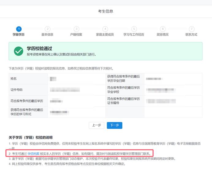 4.考生可在网上报名期间查看学历(学籍)校验结果。为确保核验顺利,建议考生提前登录“中国高等教育学生信息网”(网址:https://www.chsi.com.cn)查询本人学历(学籍)信息。未能通过学历(学籍)网上校验的考生,应在招生单位规定时间内按要求完成学历(学籍)核验。
