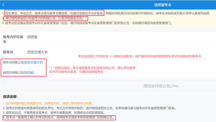 报考点:户籍在陕西或在陕西工作的考生可选报考点:6111西安交通大学(户籍在陕考生须出具户口本或户籍证明;非本省户籍考生但在陕工作的考生须上传本人近三个月的社保缴费成功记录图像)。其余地区考生选择工作或户口所在地省级教育招生考试管理机构指定的报考点办理网上报名和网上确认手续。